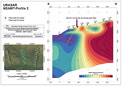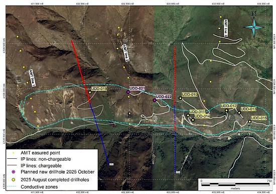 In July 2025, a trial audio-magnetotelluric (AMT) geophysical survey comprising three survey lines was completed at Urasar just as the summer drilling program was concluding. As seen in the resistivity model below, zones of low resistivity/high conductivity appear to correspond to areas of sulfide mineralization intersected in drill holes UDD-01, UDD-11, and UDD-14. The data also suggests that these holes may have been terminated prematurely—particularly hole UDD-01, which was lost at 146m just as it entered a zone of promising quartz–chalcopyrite mineralization.
