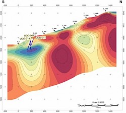 To test this interpretation, drill hole UDD-021 is planned to target one of the most conductive zones identified by the AMT survey on Line 2, located between Oxide Basin and Copper Creek. The hole is planned to a depth of 500m, considerably deeper than previous drilling.