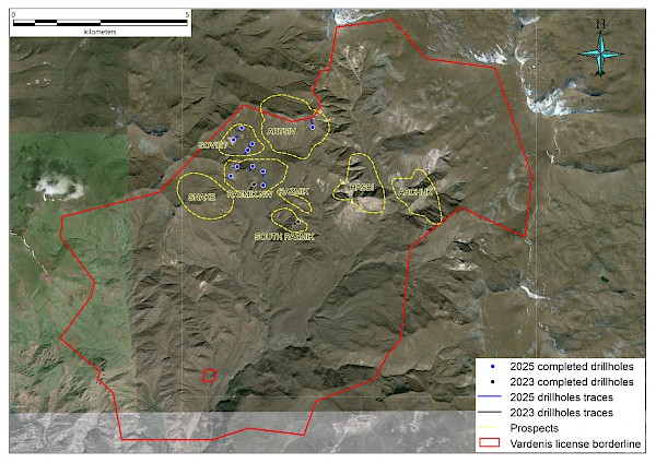 Figure 1. Image of Vardenis Exploration permit with named prospects and Hayasa drill holes