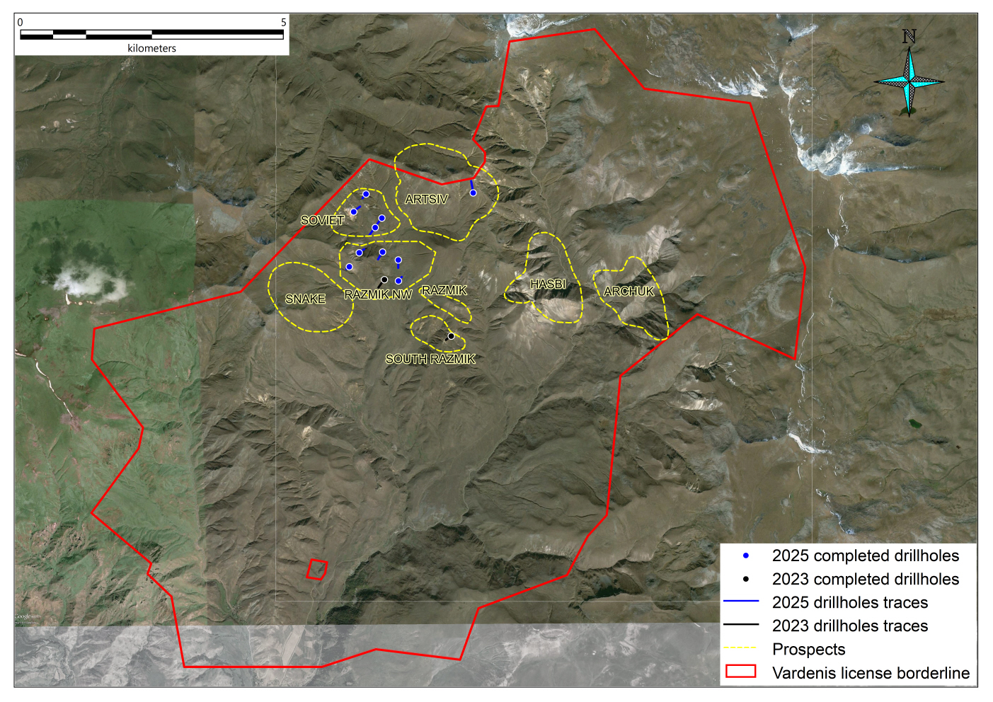 The 2025 Phase 2 drill campaign was designed to test both surface geochemical anomalies and geophysical targets identified through audio magnetotelluric (AMT) and induced polarization (IP) surveys conducted over the past 15 months. Drill holes were located in the northern section of the Vardenis permit area, within the Soviet, Razmik, and Artsiv prospects (see Figures 1 and 2). The current drill program follows from the Phase 1 program comprising 770 meters undertaken in 2023 (see news release dated November 14, 2023).