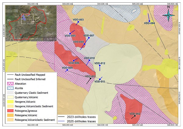 Figure 2. Vardenis license area geology and alteration with 2025 campaign drill hole traces